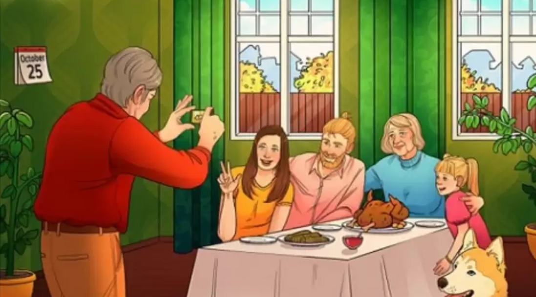 Datumet i kalendern ska vara den 22 oktober. Bilden visar en familj som firar Thanksgiving, vilket antyds av den bakade kalkonen – en traditionell rätt för denna högtid. I Ukraina infaller Thanksgiving den 22 oktober.