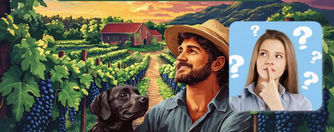 Nedan ser du en bild av en vingård där en man plockar druvor. I närheten finns hans trogna hund, som aldrig lämnar sin ägare ensam. Det verkar som om vad skulle kunna vara ovanligt här?