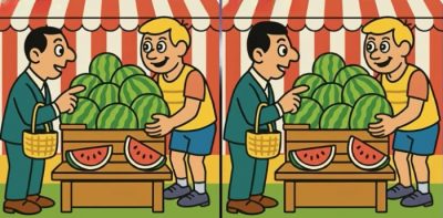 Så, är du redo för utmaningen? Ta en närmare titt på de två bilderna av en man som köper en vattenmelon. Till en början ser bilderna kanske likadana ut, men det finns 3 små skillnader. Tror du att du kan hitta dem alla på 27 sekunder? Prova och testa din synskärpa!